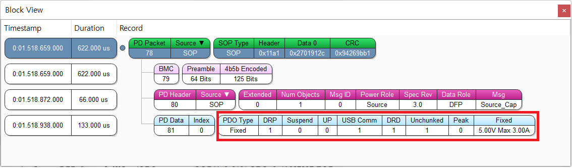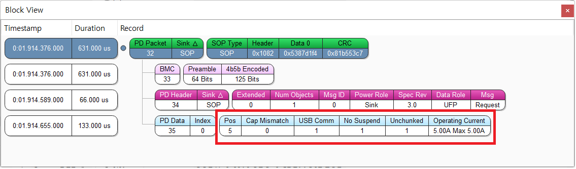 위 메시지는 노트북에 충전기로부터 충전 프로파일 리스트를 전달 받은 뒤 그 중에서 'Pos 5 = Position 5' 즉, 충전기의 충전 프로파일 중에서 5번째 프로파일을 선택하여 충전하겠다는 의미입니다. 위의 충전기 쪽에서 온 프로파일 메시지를 보면 5번째 프로파일은 20V 고정 전압 프로파일 입니다.