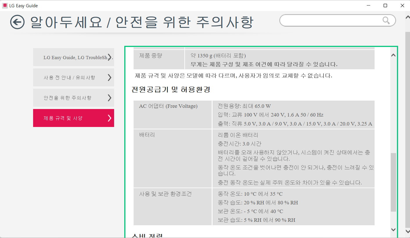 혹시나 해서 제품 사용메뉴얼도 다운받아 보았지만 동본된 충전기의 스펙만 확인할 수 있었을 뿐 노트북의 충전 규격은 확인할 수 없었죠.
