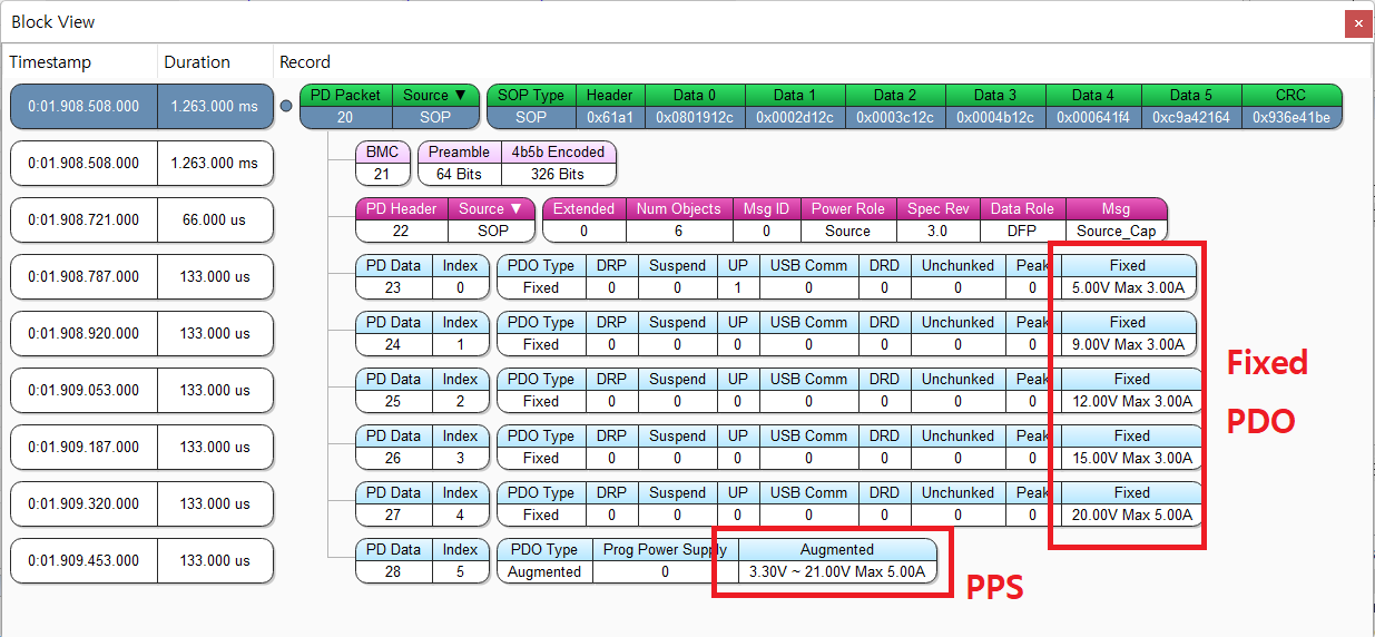 실험에 사용된 충전기의 충전 프로파일은 총 6개로 Fixed PDO 즉, 고정전압을 사용하는 프로파일 5개와 전압을 미세하게 조절할 수 있는 Augmented PDO 즉, PPS 기능의 프로파일 1개로 구성되어 있는 것을 확인할 수 있습니다.