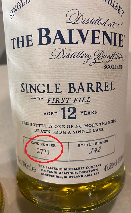 집에 있는 발베니 12년 싱글 베럴 제품입니다. 싱글 베럴 = 싱글 캐스크 입니다. 단일 캐스크에서 나온 원액만을 사용했고, 해당 캐스크의 번호는 2771번이며, 그 캐스크로부터 만들어진 병은 300병이고 그 중에서 242번째 병 제품이라는 의미입니다.
